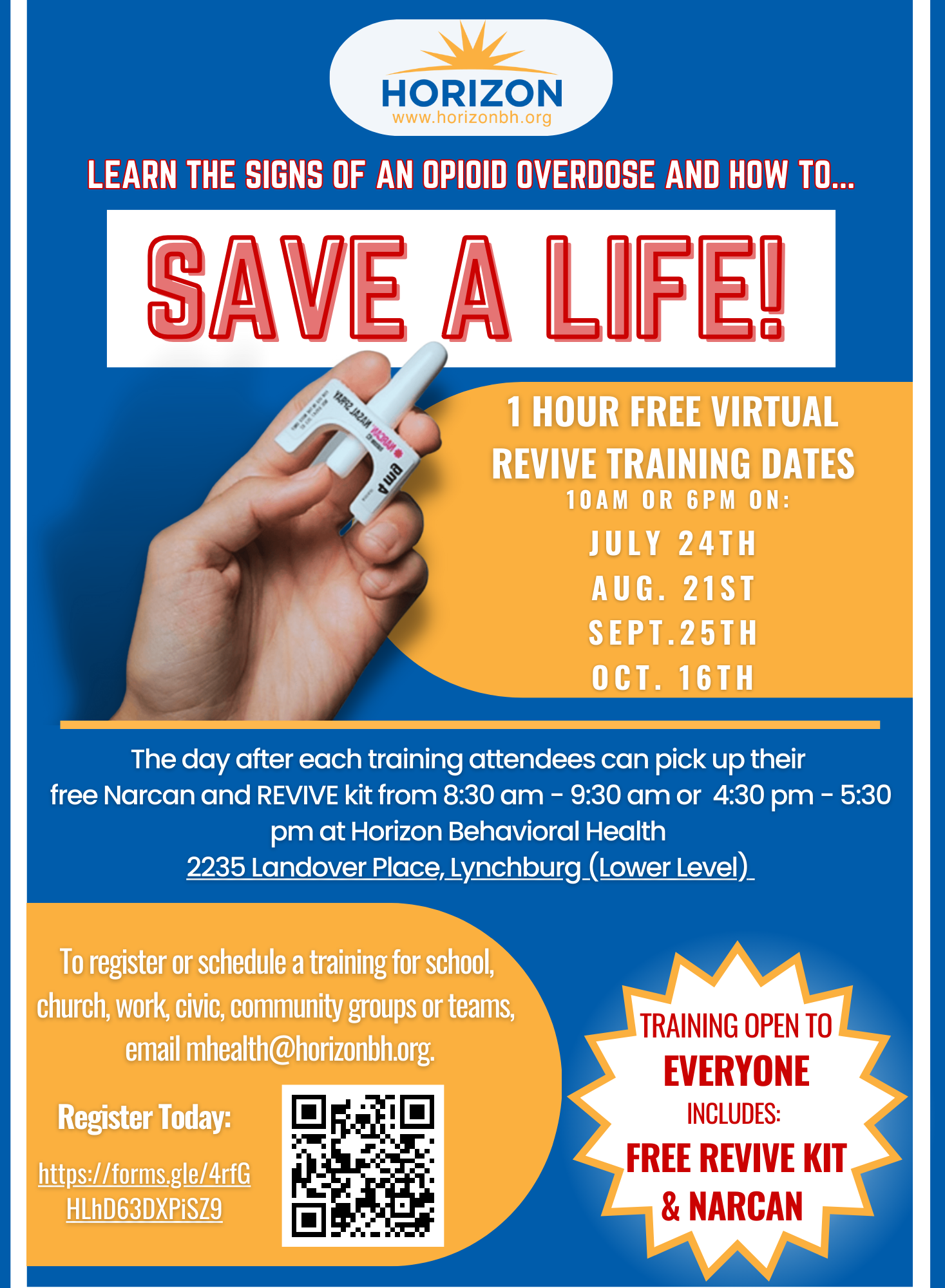 The REVIVE! training is between 1-1.5 hours long. This training covers understanding opioids, how opioid overdoses happen, risk factors for opioid overdoses, and how to respond to an overdose emergency with the administration of Naloxone. Those attending a REVIVE Training instructed by Horizon Behavioral Health will receive a REVIVE kit which includes supplies needed to administer Narcan and two free doses of Narcan.